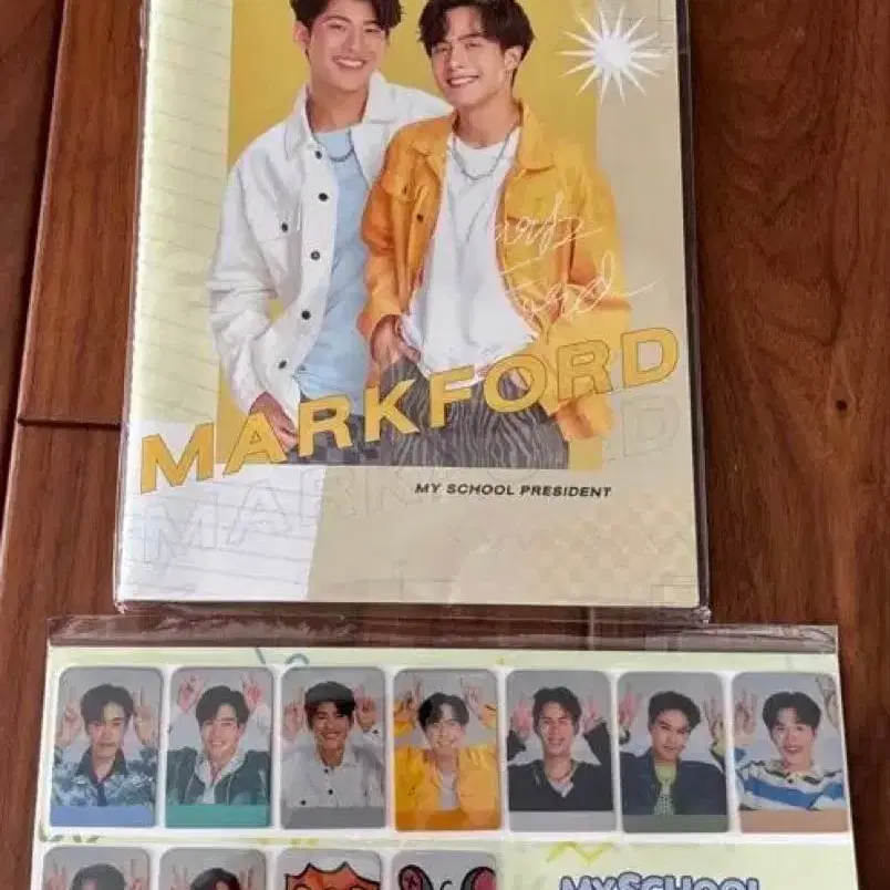 태국 BL 드라마 [My School President]의 공식 굿즈인 [MARKFORD 노트]와 스티커 세트입니다. 노트: GMMTV 공식 굿즈이며, 사이즈는 14.5 x 21 cm, 60페이지입니다. 스티커: [My School President Prom Night Live On Stage]의 공식 스티커입니다. 캐릭터: Mark (마크)와 Ford (포드)의 사진이 특징입니다.