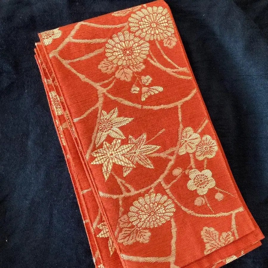 감색 바탕에 다양한 길조의 의미를 지닌 아마색 꽃과 잎 무늬가 장식된 직물의 세련되고 아름다운 반폭 오비. 안목 있는 분들의 일품입니다. 폭 14cm 길이 342.5cm - 소재: 면 또는 실크 혼합 직물. 가치 있는 새상품급을 파격적인 가격으로 판매합니다. 노클레임/노리턴을 부탁드립니다. 이미지와 실물의 색상 일치 및 완벽함을 추구하시는 분은 구매를 삼가 주시기 바랍니다. - 스타일: 반폭 오비 방문해 주셔서 감사합니다.