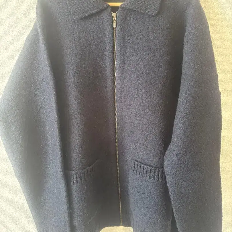울 계열 소재의 네이비 색상 가디건, 지퍼와 앞면에 포켓이 있습니다.