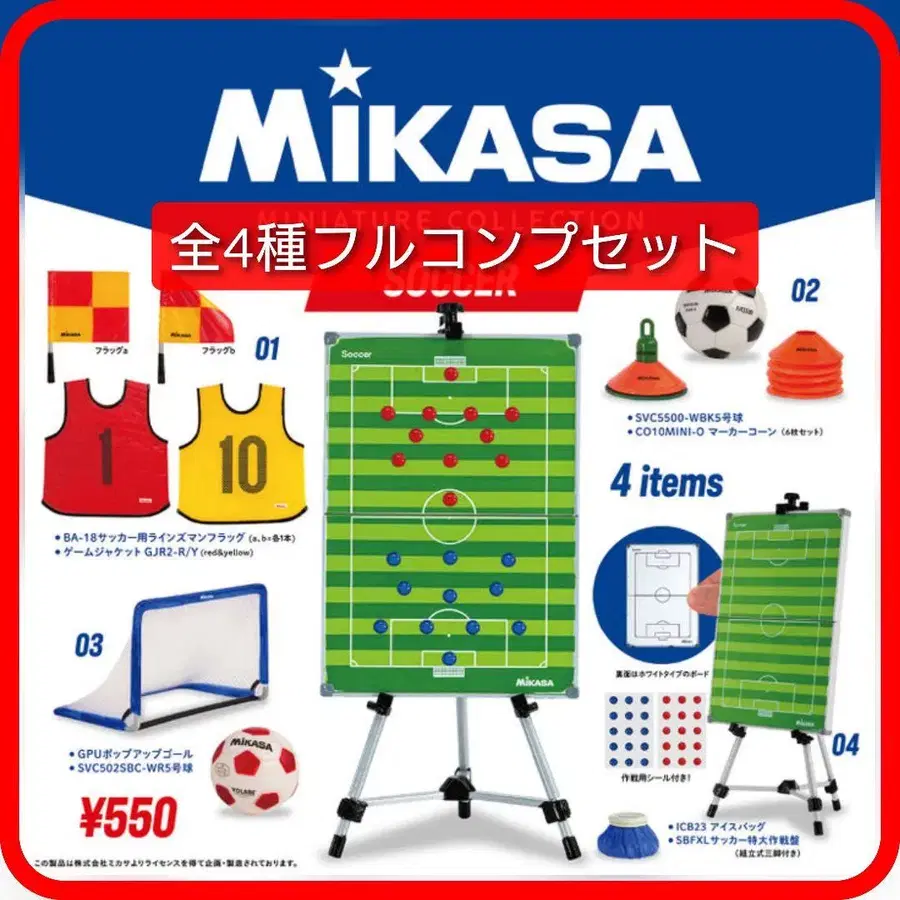 MIKASA 미니어처 컬렉션 축구 전 4종 풀 컴프 세트입니다. 학교나 동아리 활동에서도 대활약! 트레이닝에 빠뜨릴 수 없는 [MIKASA]의 축구 미니어처 컬렉션! ■ 내용 01 BA-18 축구용 라인즈맨 플래그 (a, b x 각 1개) 게임 자켓 GJR2-R/Y (red&yellow) 02 SVC5500-WBK 5호구 CO10MINI-O 마커 콘 (6개 세트) 03 GPU 팝업 골 SVC502SBC-WR 5호구 04 ICB23 아이스 백 SBFXL 축구 특대형 작전판 (삼각대 포함) ※ 설명서는 캡슐에 들어있던 특성상 약간 구부러진 부분이 있을 수 있으니 미리 양해 부탁드립니다. ※ 캡슐은 포함되지 않습니다. ※ 봉투는 미개봉입니다. ※ 캡슐 토이는 페인팅이 옅거나, 번지거나, 작은 흠집 등이 흔하게 보입니다. 미개봉품이므로 초기 불량 시에는 제조사에 직접 문의 부탁드립니다. 교환 등의 대응은 불가하오니 미리 양해 부탁드립니다. [컴프] MIKASA 미니어처 컬렉션 축구 가챠 MIKASA