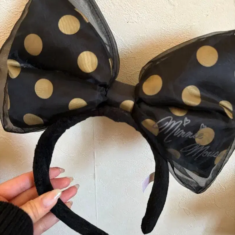블랙 베이스에 금색 물방울 패턴이 들어간 미니 마우스 스타일 머리띠입니다.