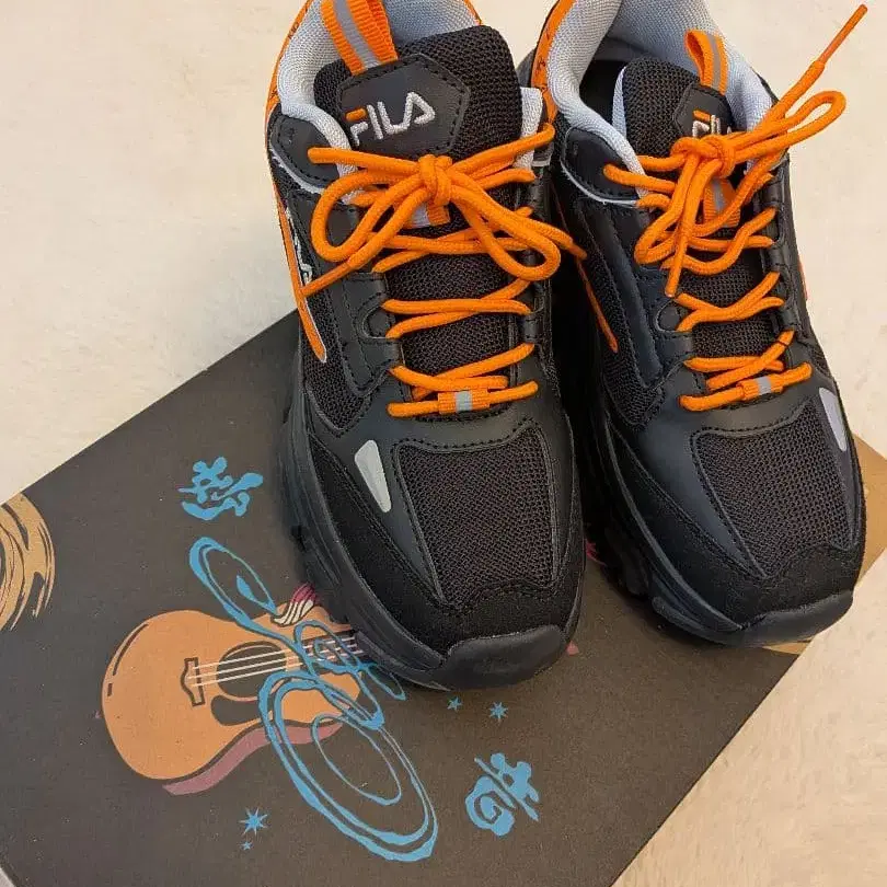 FILA의 블랙과 오렌지 스니커즈, 메쉬 소재로 쿠션성이 높은 디자인. - 브랜드: FILA - 색상: 블랙/오렌지 - 스타일: 스니커즈 - 디자인: 메쉬 소재/쿠션성 오사카 라이브에 한 번 신고 갔습니다.