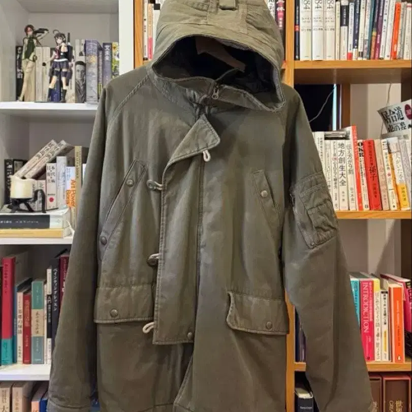 조정 가능한 후드와 프론트 단추식의 올리브색 밀리터리 자켓. 후드는 상당히 깊어 얼굴이 완전히 가려질 정도입니다. 코엔지의 세컨드 스트리트에서 구매했습니다. 방문해 주셔서 감사합니다. 사이즈 - FREE SIZE 컬러 - 카키 계열