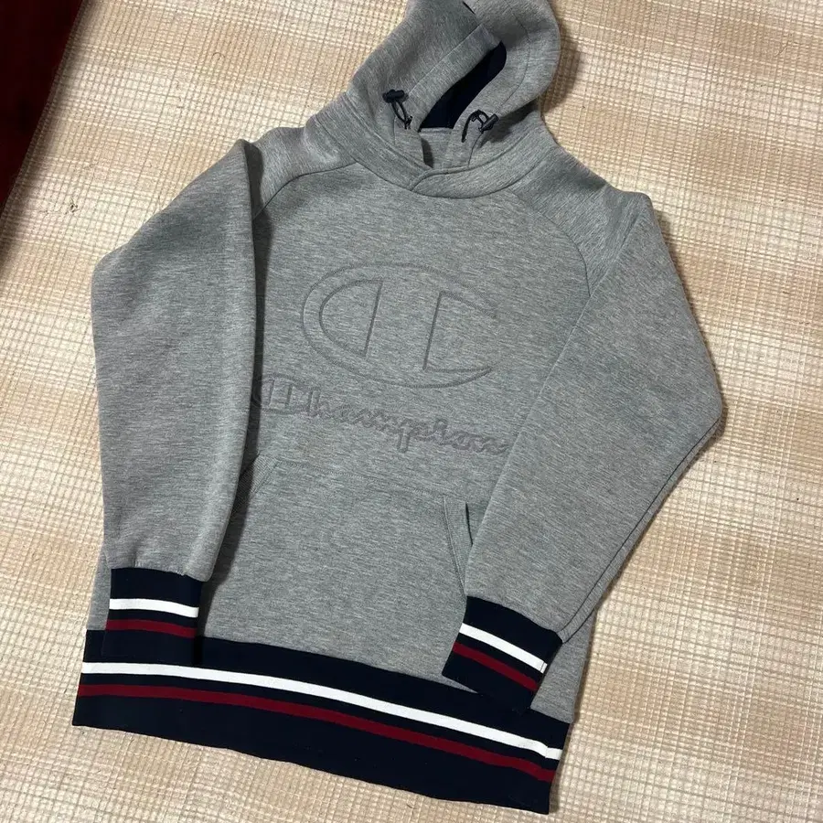 Champion의 그레이 후드티, 로고 자수, 리브 소매와 스트라이프 밑단이 특징입니다. - 브랜드: Champion - 사이즈: S - 색상: 그레이 - 디자인: 로고 자수 - 소매: 리브 포함 - 밑단: 스트라이프 디자인 방문해 주셔서 감사합니다. 색상 - 그레이 계열