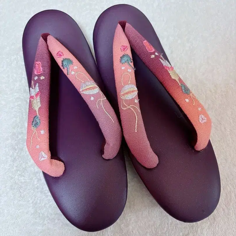 보라색 조리, 자수 디자인의 하나오, 미끄럼 방지 밑창. - 색상: 보라색과 핑크색 콤비네이션 - 소재: 합성수지와 원단의 하나오 - 밑창 디자인: 미끄럼 방지 밑창 ※ 우레탄 밑창으로 되어 있어 미끄럽지 않습니다. - 장식: 자수 디자인의 하나오 ※ 미사용이지만 개인 보관이므로 신경 쓰이시는 분은 삼가해 주시기 바랍니다. ※ 사이즈 M, 본인 25cm로 이미지하시면 됩니다. ※ 상자는 없으므로 간편 포장으로 발송합니다. 방문해 주셔서 감사합니다.