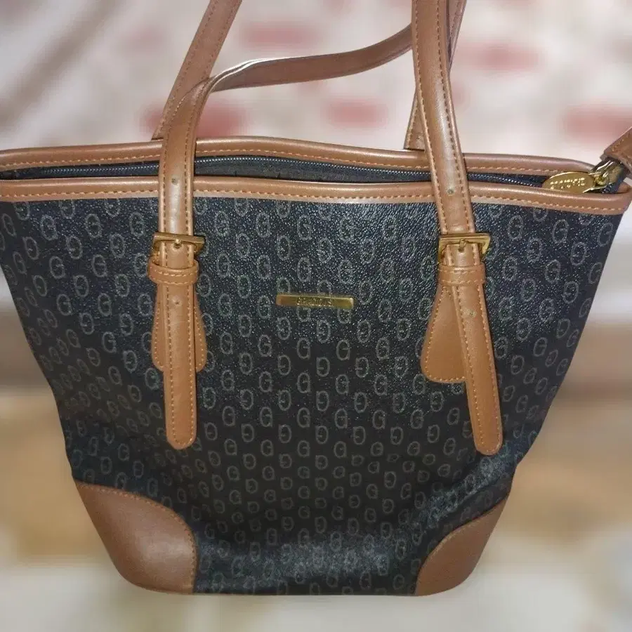 네이비와 브라운의 로고 패턴이 특징인 숄더백. - 브랜드: GRACIOUS - 색상: 네이비와 브라운 - 소재: 캔버스와 합성 피혁 - 로고: GRACIOUS의 금속 플레이트 - 지퍼: 골드 지퍼 - 디자인: 로고 패턴 - 손잡이: 2개의 손잡이 방문해 주셔서 감사합니다.