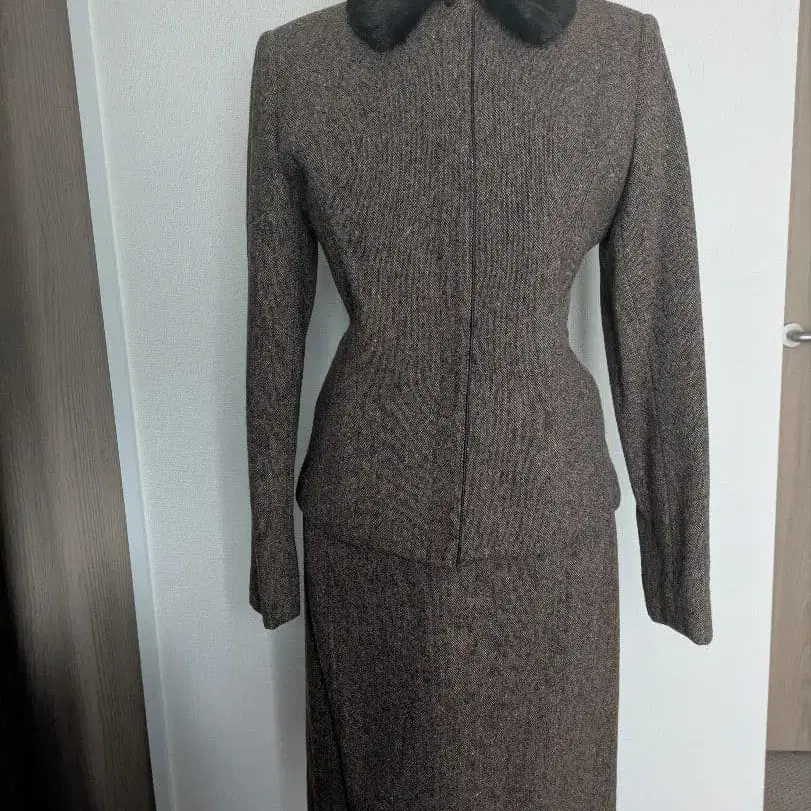 브라운 울 혼방 퍼 포함 셋업 트위드풍
