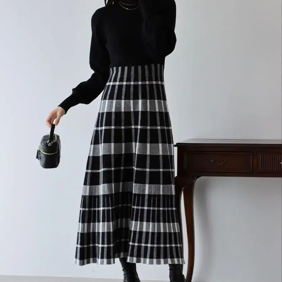 한 장만으로도 멋스러운 볼륨 소매 니트 ✕ 체크 무늬 스커트의 도킹 원피스.
