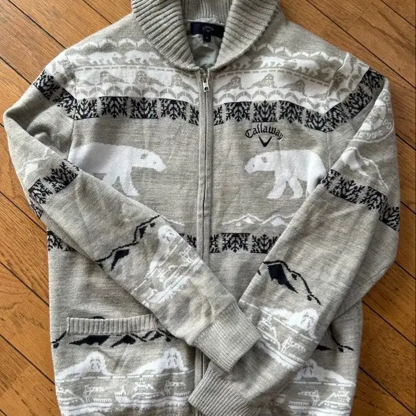 집업 니트 블루종. - 브랜드: Callaway - 사이즈: M - 디자인: 곰 무늬 니트 가디건 - 색상: 그레이 - 스타일: 집업 - 소재: 아크릴, 울, 나일론 몇 년 전 새 상품으로 구매했으나, 2~3회 착용 후 착용하지 않았습니다. 매우 깨끗한 상태입니다. 중고품이므로 이해하시는 분께서 검토해 주시기 바랍니다.