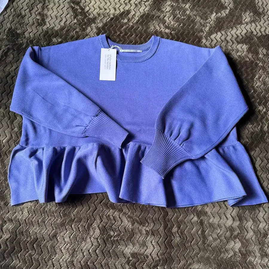 페플럼 디자인의 보라색 니트탑, 벌룬 슬리브가 특징입니다. - 색상: 보라색 - 디자인: 프릴이 달린 긴팔 상의 - 소재: 폴리에스테르 - 소매 스타일: 벌룬 슬리브 방문해 주셔서 감사합니다.