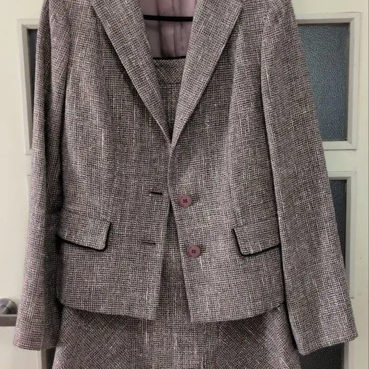 자동 번역되었어요. 원문보기보라색이 섞인 차분한 핑크 계열의 트위드 느낌 수트입니다.