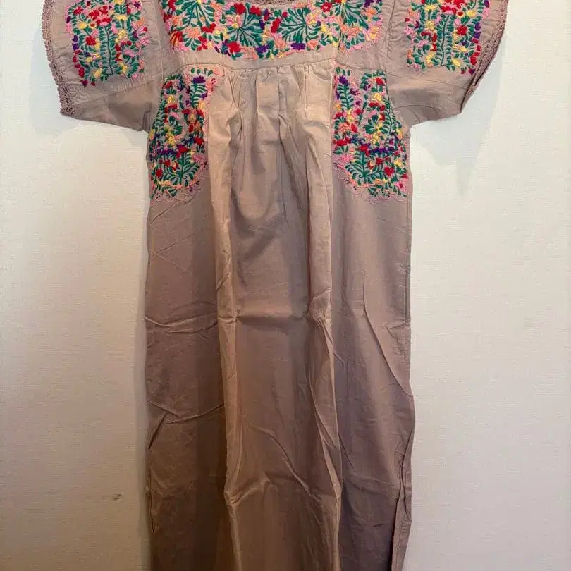 자동 번역되었어요. 원문보기컬러풀한 꽃무늬 자수가 들어간 핑크 베이지 반팔 원피스, 넉넉한 실루엣으로 쾌적한 착용감.