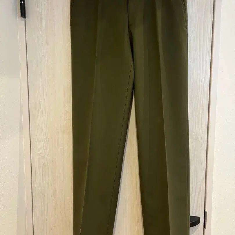 올리브 색상의 스트레이트 핏 슬랙스, 센터 프레스 디자인. - 시즌: 18AW - 색상: 올리브 - 브랜드: DRIES VAN NOTEN - 스타일: 슬랙스 - 디자인: 센터 프레스 - 핏: 스트레이트 울처럼 부드러운 느낌이 아닌 탄력 있는 디자인입니다. 울 폴리 소재로, 코튼처럼 주름이 잘 생기지 않아 매우 고급스러운 슬랙스입니다. 올리브 색상으로 블랙, 화이트뿐만 아니라 브라운, 베이지 등 어스 컬러에도 잘 어울려 가을/겨울 시즌에 추천하는 색상입니다. 사이즈 - L