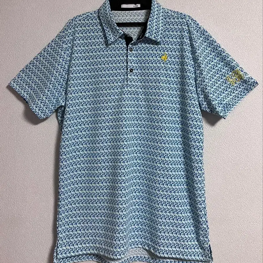 기하학 패턴의 푸른 골프 피케 셔츠, 노란색 닭 자수 포함.