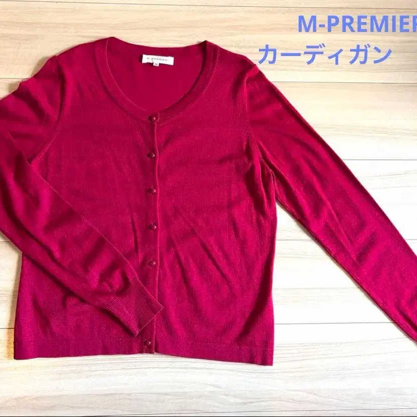 심플한 버튼이 달린 빨간색에 가까운 핑크색 가디건, 긴팔로 사용하기 쉬운 디자인.