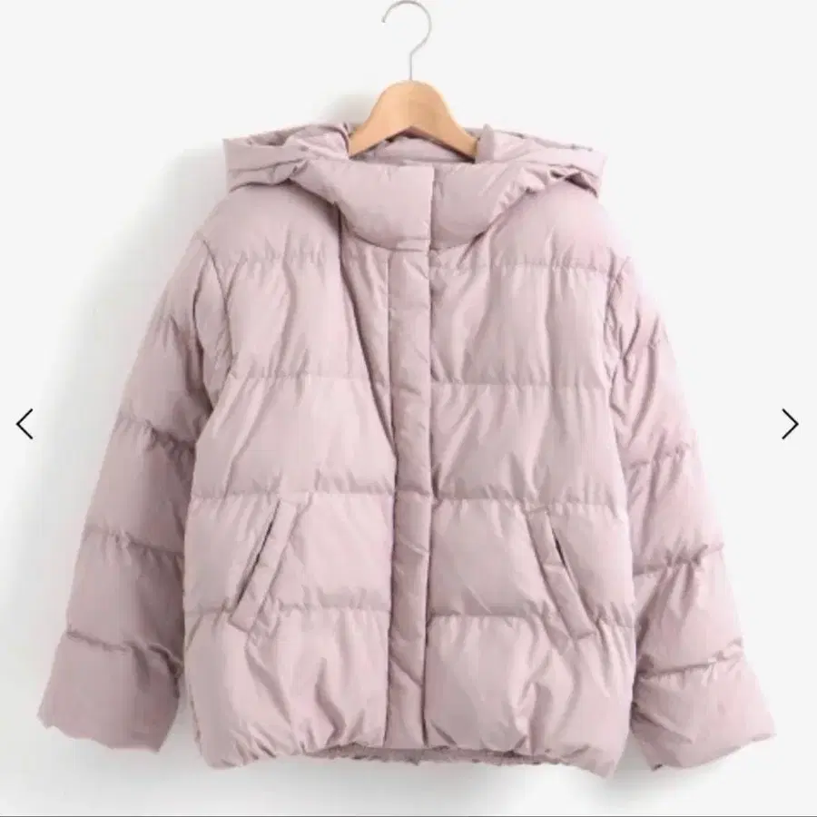 후드 부착의 옅은 핑크색 캐주얼 다운 자켓, 겨울에 최적.