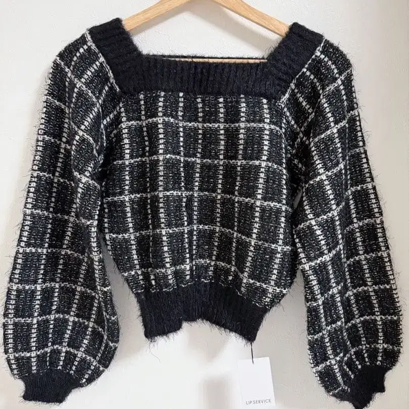블랙과 화이트 체크 무늬, 벌룬 슬리브 니트 스웨터. - 색상: 블랙과 화이트 체크 무늬 - 디자인: 스퀘어넥, 벌룬 슬리브 - 소재: 니트 - 스타일: 캐주얼 방문해 주셔서 감사합니다.