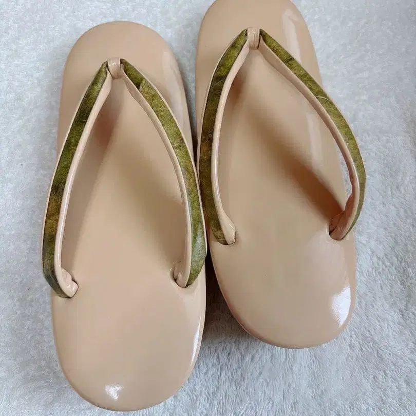 베이지 색상의 합성 피혁 조리, 그린 컬러의 하나오 부착.