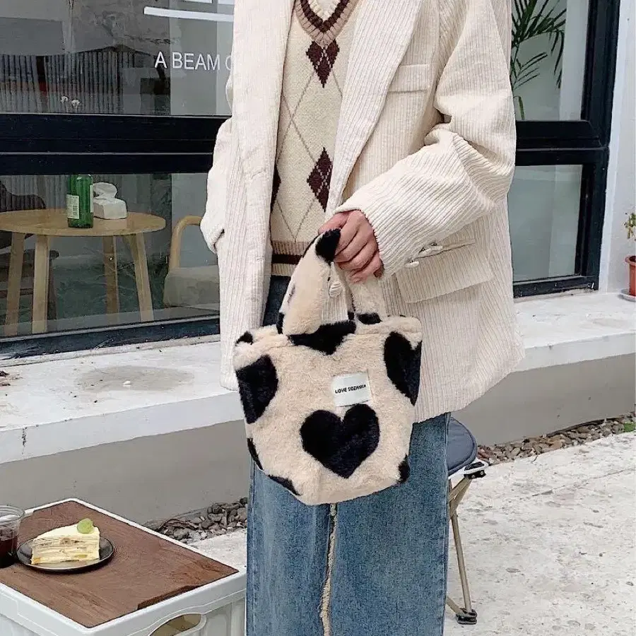 하트 무늬가 귀여운 퍼 소재의 미니 토트백.