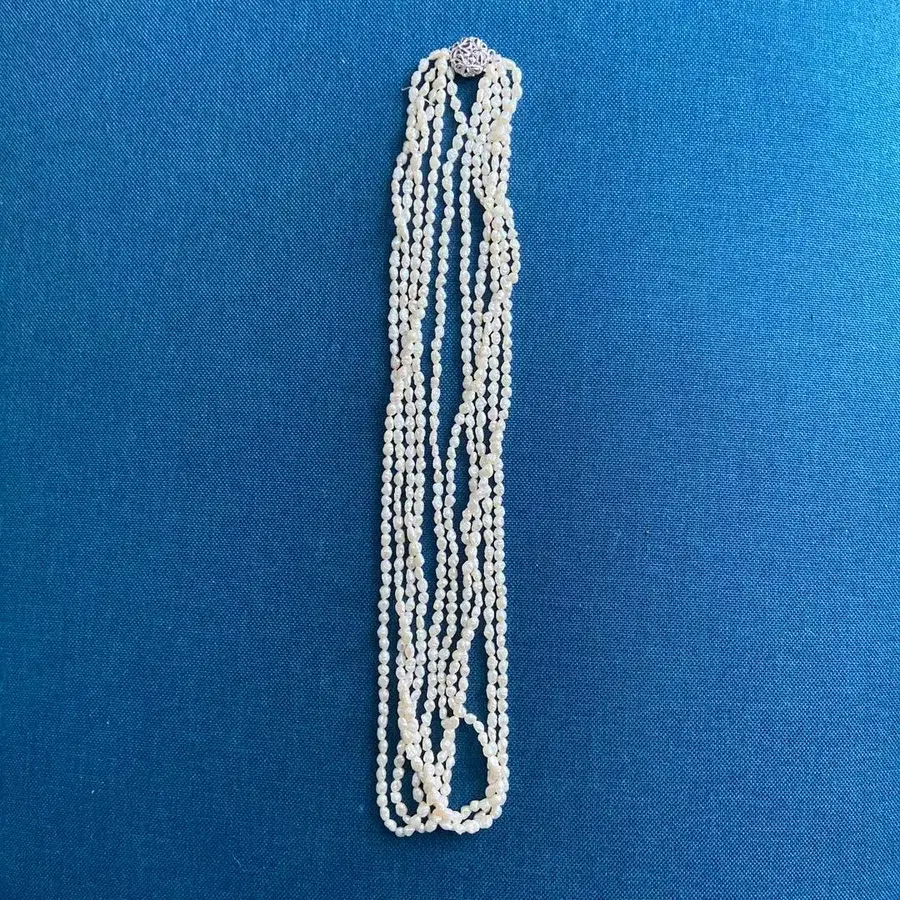 복수의 스트랜드 화이트 진주 5연 목걸이, 장식적인 은제 클로징 포함. - 색상: 화이트 - 소재: 진주 - 클로징: 장식적인 은제 클로징 - 스타일: 롱 목걸이 길이 약 60cm가 5세트 진주의 품질이 좋고, 매우 아름다운 광택입니다. 상당한 골동품으로 당시 고가에 구매한 상품입니다. 케이스는 포함되지만, 전용 케이스는 아닙니다. 구매 후 컴플레인 및 반품은 받지 않습니다. 이해 부탁드립니다.