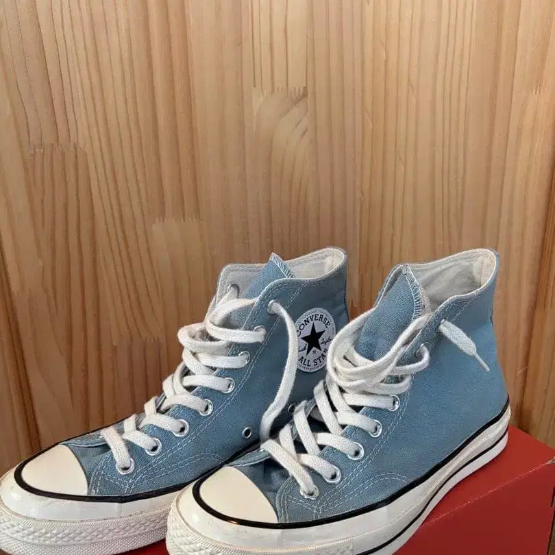스카이블루 색상의 CONVERSE CT70 (척테일러) 하이컷 스니커즈. - 브랜드: CONVERSE - 모델: ALL STAR - 색상: 스카이블루 - 스타일: 하이컷 - 밑창: 러버 솔 - 소재: 캔버스 - 사이즈: 25cm 수년 전 한국에서 구매했습니다. 몇 번 착용했습니다.