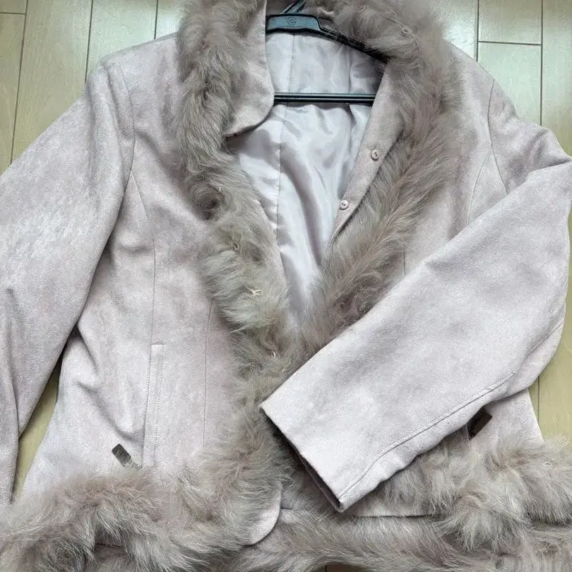 자동 번역되었어요. 원문보기스웨이드풍 소재에 퍼가 달린 라이트 핑크 무스탕 코트.