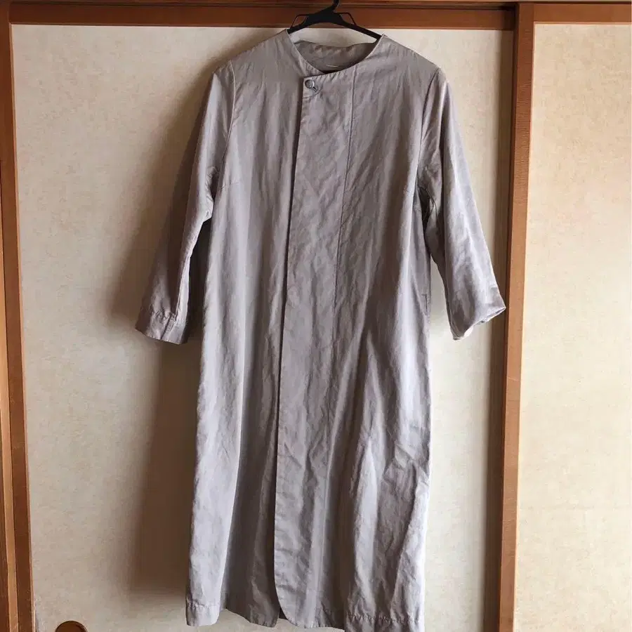 베이지 롱 코트입니다. 노카라 디자인으로 겉옷으로도 활용 가능합니다. 릴랙스한 실루엣으로 편안하게 착용하실 수 있습니다.