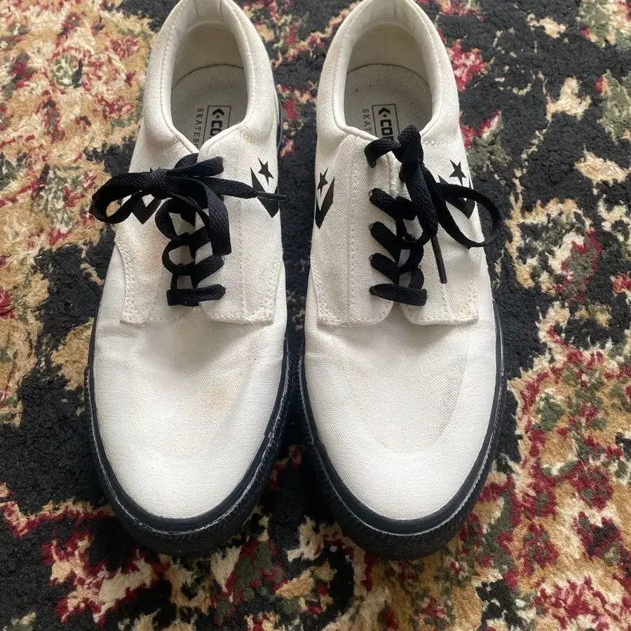 스케이트보드용 화이트 스니커즈, 별 디자인 포함.
