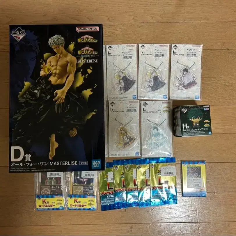 D상 올 포 원 MASTERLISE 사이즈: 약 25cm H상 쵸코놋코 피규어 (데쿠) 사이즈: 약 4cm I상 에리의 뿔 모양 아크릴 참 (데쿠, 올마이트, 시가라키, 올포원) ※ AFO만 2개 사이즈: 약 6cm J상 히어로 카드풍 아크릴 미러 카드 (데쿠) 사이즈: 약 8cm K상 카드 홀더 (올마이트, 호크스) 사이즈: 약 11cm L상 스티커 세트 x 5 사이즈: 약 5cm (8장 세트)