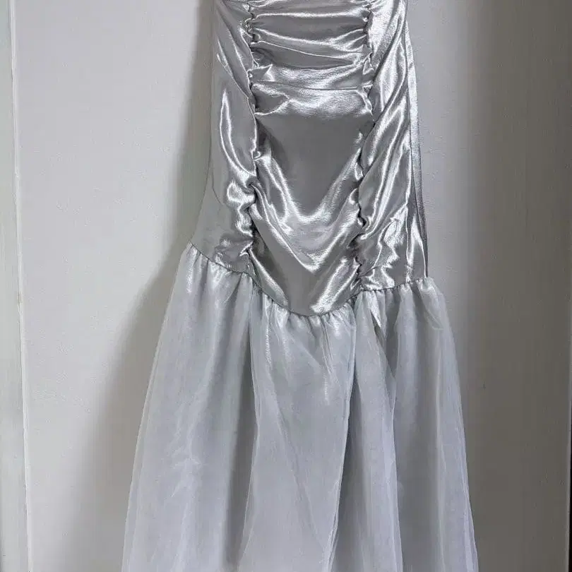실버 새틴과 튤을 사용한 플레어 롱 스커트, 드레이프 디자인이 특징입니다. - 색상: 실버 - 소재: 새틴과 튤 - 디자인: 플레어 실루엣, 드레이프 가공 - 스타일: 롱 스커트 방문해 주셔서 감사합니다.