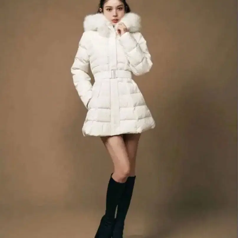 그레일 벨트 포함 퍼 A라인 다운 코트