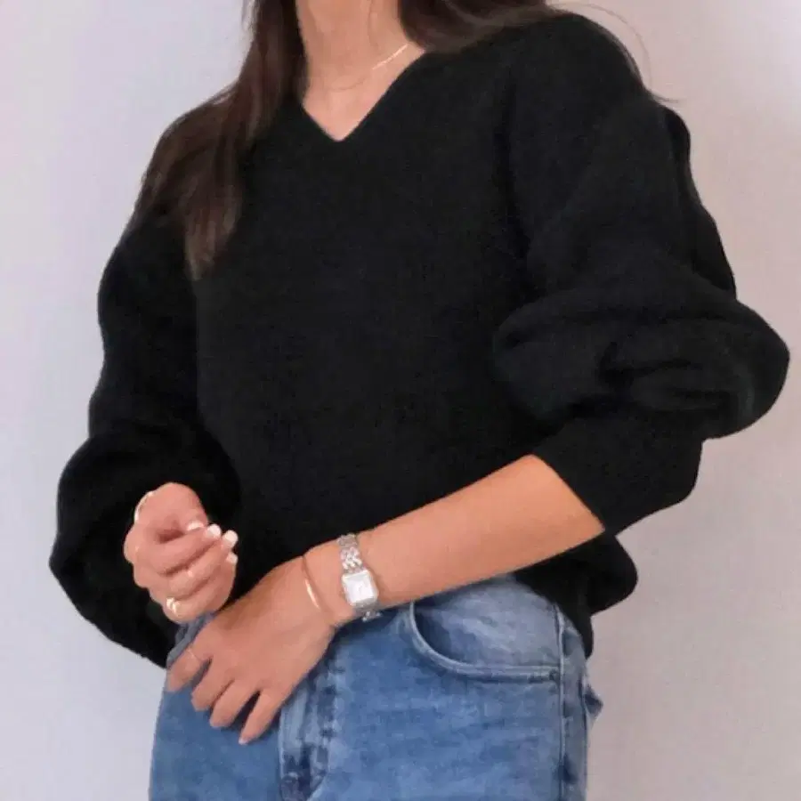 데콜테 라인을 예쁘게 보여주는 V넥 라인으로 캐주얼한 분위기 속에서도 여성스러움을 연출합니다.