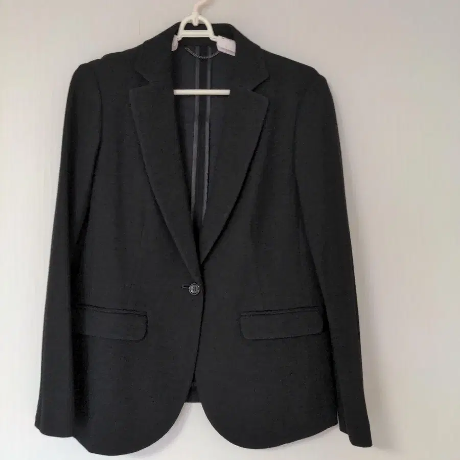 블랙 컬러 40호. 프론트 오픈 버튼 하나와 장식 포켓 2개가 달려 있습니다.