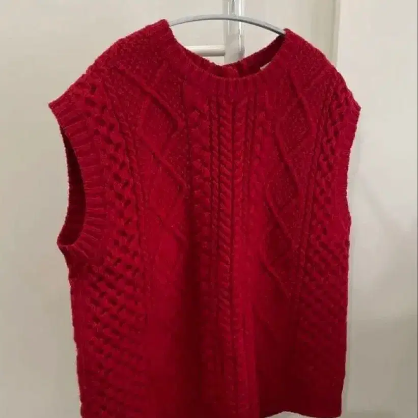 케이블 짜임 디자인의 빨간색 슬리브리스 니트 베스트.