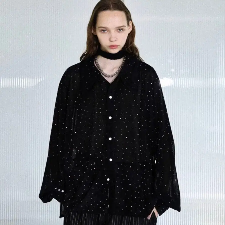 전면에 크고 작은 큐빅이 흩뿌려져 있어 존재감 있는 셔츠로 완성했습니다.