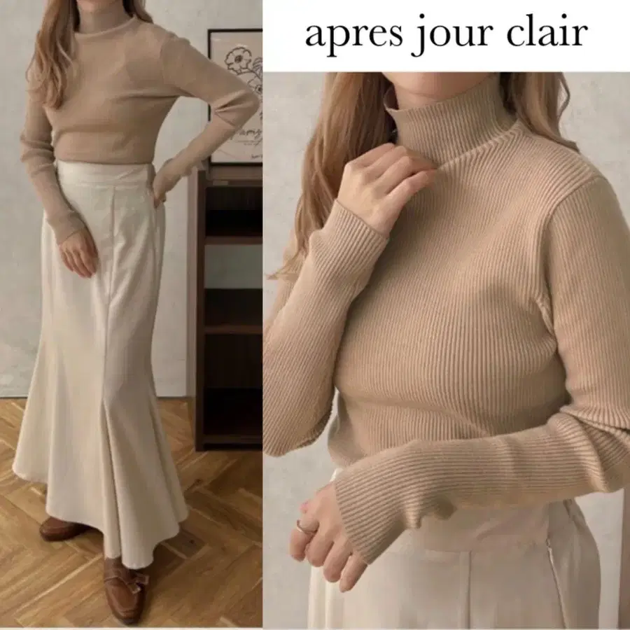 아프레 주르 클레어 하이넥 리브 니트 상의 카페오레