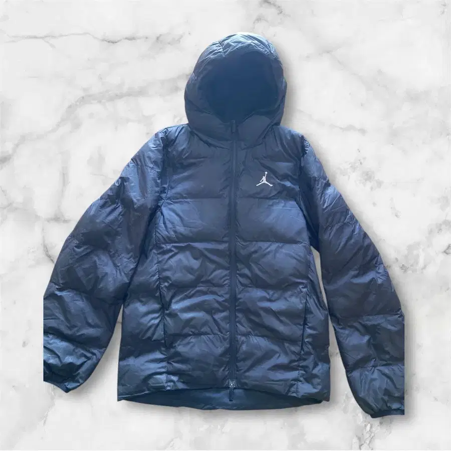 후드 부착된 블랙 다운 자켓, 점프맨 로고 포함.