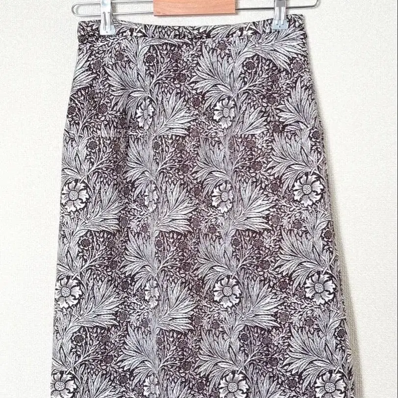 매킨토시 런던 특유의 꽃무늬 프린트가 들어간 브라운과 화이트 색상의 무릎 기장 스커트, 안감 부착.
