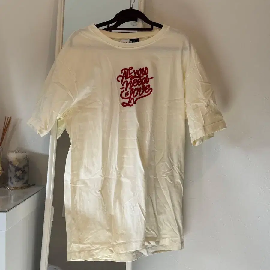 더 비틀즈의 하트형 [LOVE] 로고가 특징인 크림색 T셔츠, L 사이즈.