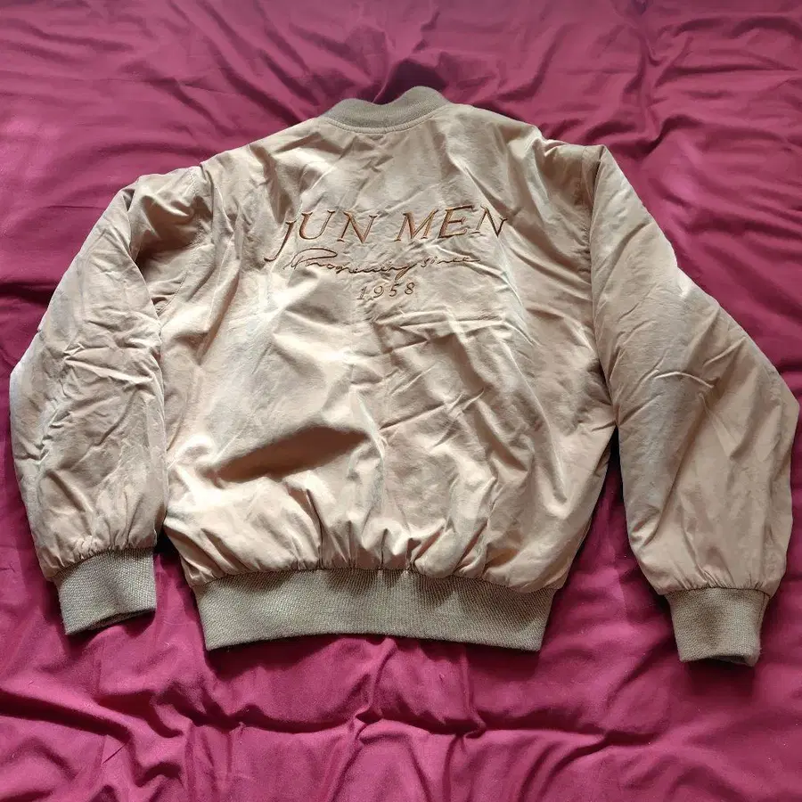 오렌지 계열 카멜 색상의 JUN MEN 점퍼입니다. 심플하고 스타일리시한 디자인.