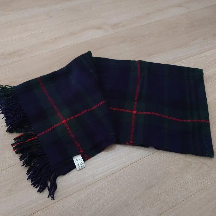 아크릴 100% 타탄 체크 머플러, 네이비와 그린의 배색이 특징.