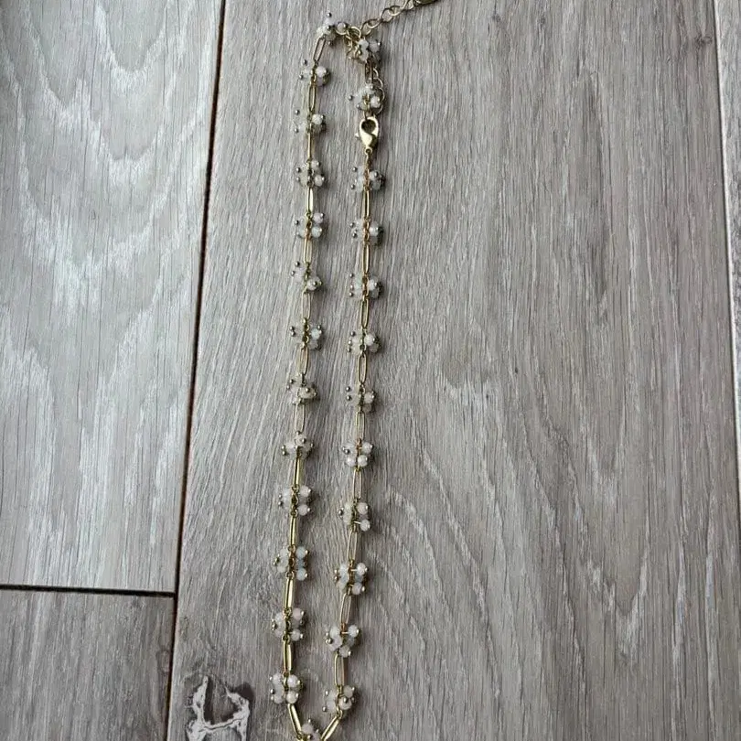 꽃 모티브와 인조 진주를 사용한 엘레강트한 골드 목걸이. - 디자인: 꽃 모티브가 장식된 골드 목걸이 - 소재: 금속과 인조 진주의 조합 - 길이: 조정 가능한 체인 포함 방문해 주셔서 감사합니다.