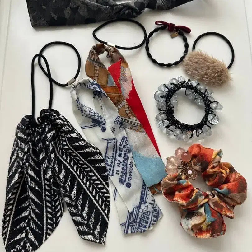 백화점이나 아네모네에서 구매한 헤어 액세서리 세트입니다. 천으로 된 머리끈은 사용감이 있지만, 그 외에 스크런치 (비쥬 부착 2개)와 헤어밴드 등은 미사용입니다. 미니멀리스트를 위해 판매합니다. 즉시 구매 OK입니다.