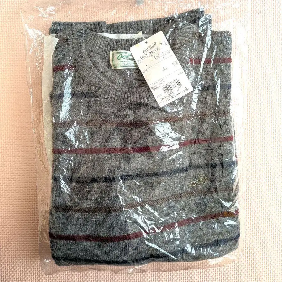 그레이 색상 바탕에 빨간색, 파랑, 브라운 색상의 보더가 디자인된 스웨터입니다.