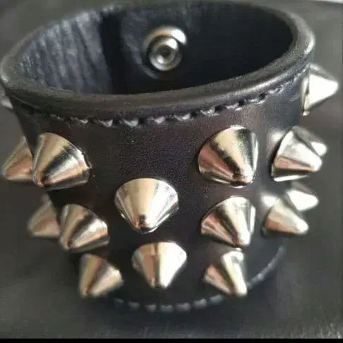 검색)) 가죽 공예, 가죽 세공, HARDCORE PUNK, CRUST, 하드코어 펑크, 크러스트, 펑크, 찡 장식 본인이 핸드메이드로 제작한 12mm 런던 콘(코니컬 스터드)을 사용한 본 가죽제 리스트 밴드입니다. 가죽과 손바느질 스티치의 색상은 블랙입니다. 폭 6cm. 이미지는 샘플이므로 구매를 희망하시는 분은 손목 둘레 사이즈를 측정하신 후 댓글로 알려주세요. 단품 구매 시 가격 인하 협상은 대응하지 않습니다. ※ 스티치 색상 변경(가격 변동 없이 희망하시는 색상 지정 가능), 버클식 제작도 가능하므로 희망하시는 분은 편하게 말씀해주세요(내용에 따라 가격 변동 있습니다).
