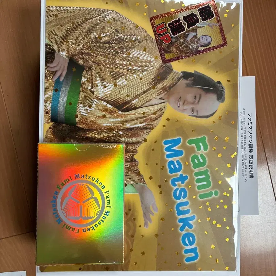 골드 컬러 의상을 입은 Fami Matsuken의 굿즈, 승부운 UP 스티커와 빅 트럼프 운세 카드 2종 세트입니다.