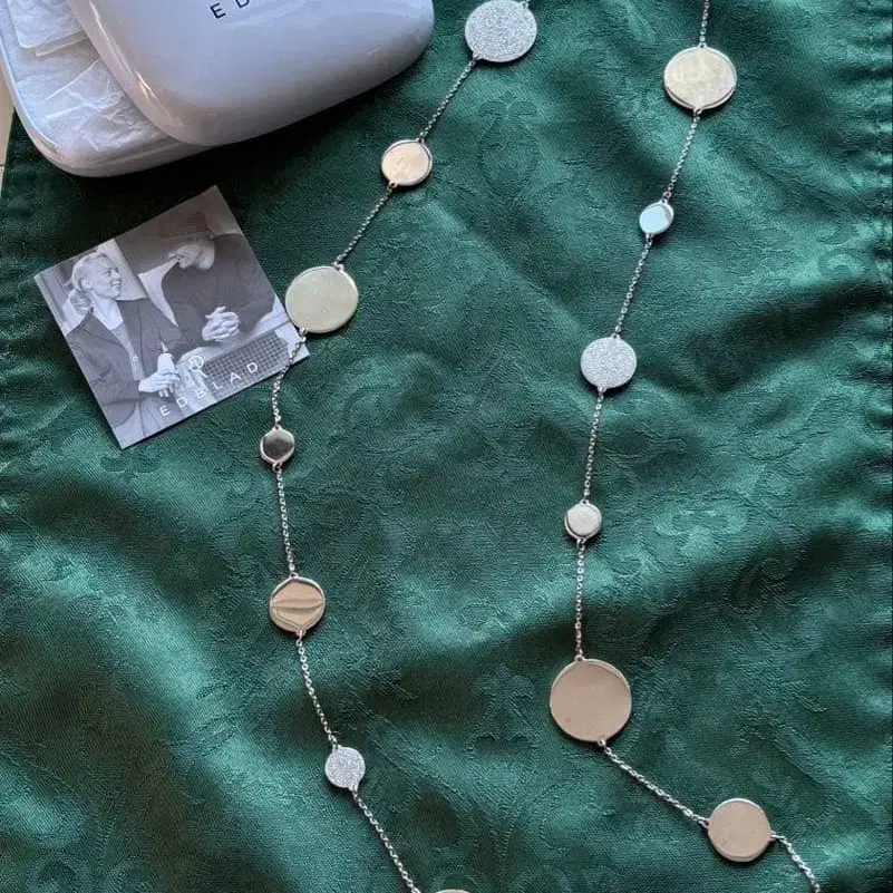 북유럽 인기 브랜드 EDBLAND의 원형 디스크가 이어지는 실버 목걸이입니다. 부속물 있음.