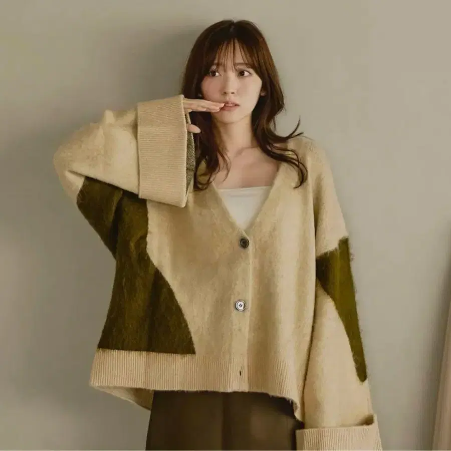 베이지와 올리브 그린 배색의 울 혼방 V넥 가디건, 버튼 포함 긴팔. - 색상: 베이지와 올리브 그린 배색 - 디자인: V넥, 버튼 포함 - 소재: 울 혼방 - 소매: 긴팔, 리브 니트 소매단 방문해 주셔서 감사합니다. 구매 후 한 번도 착용하지 않았습니다. 택 포함입니다. 현재는 판매하지 않는 상품이라 다소 높은 가격으로 판매합니다. 자택 보관으로 인한 주름 등이 있을 수 있으나, 양해 부탁드립니다. 프로필 확인 후 구매 부탁드립니다.