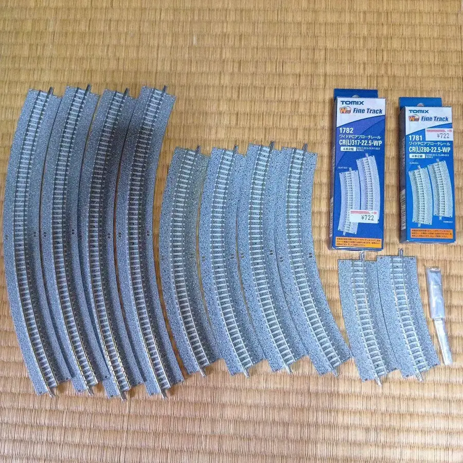 TOMIX FineTrack 1781 CR(L)280-22.5-WP 1782 CR(L)317-22.5-WP (중고품, 부품 일부 누락) C280-45-WP x 4 C391-45-WP x 4 CL280-22.5-WP x 2 와이드 레일 조인트 1781번은 내용물 확인을 위해 개봉했으며 상자에 약간의 찢김이 있습니다. 1782번은 중고품이며 와이드 레일 조인트가 누락되었습니다. 사진 3: C280-45-WP 중 1개 변색이 있습니다. 사진 4: C280-45-WP 중 다른 1개 조이너가 누락되었습니다. 사용했던 제품이므로 미세한 흠집과 얼룩이 있습니다. 레일 통전 확인은 하지 않았습니다. 걸쇠 파손 없음. 레일 클리닝이 필요할 것으로 보입니다. 신경 쓰이는 분은 구매를 자제해주세요!!! 간편 포장으로 발송됩니다. 개별 포장 없이 묶어서 포장해 드립니다. 동의하시는 분만 검토해주세요. N 게이지 레일 슈퍼 오치쿤 기차 #슈퍼오치쿤기차