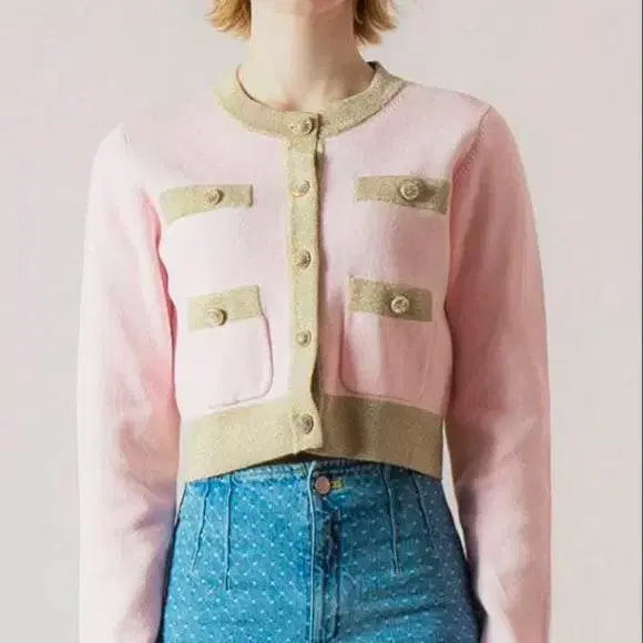 골드 비쥬 버튼과 고급 라메 배색이 너무 귀여운 가디건.